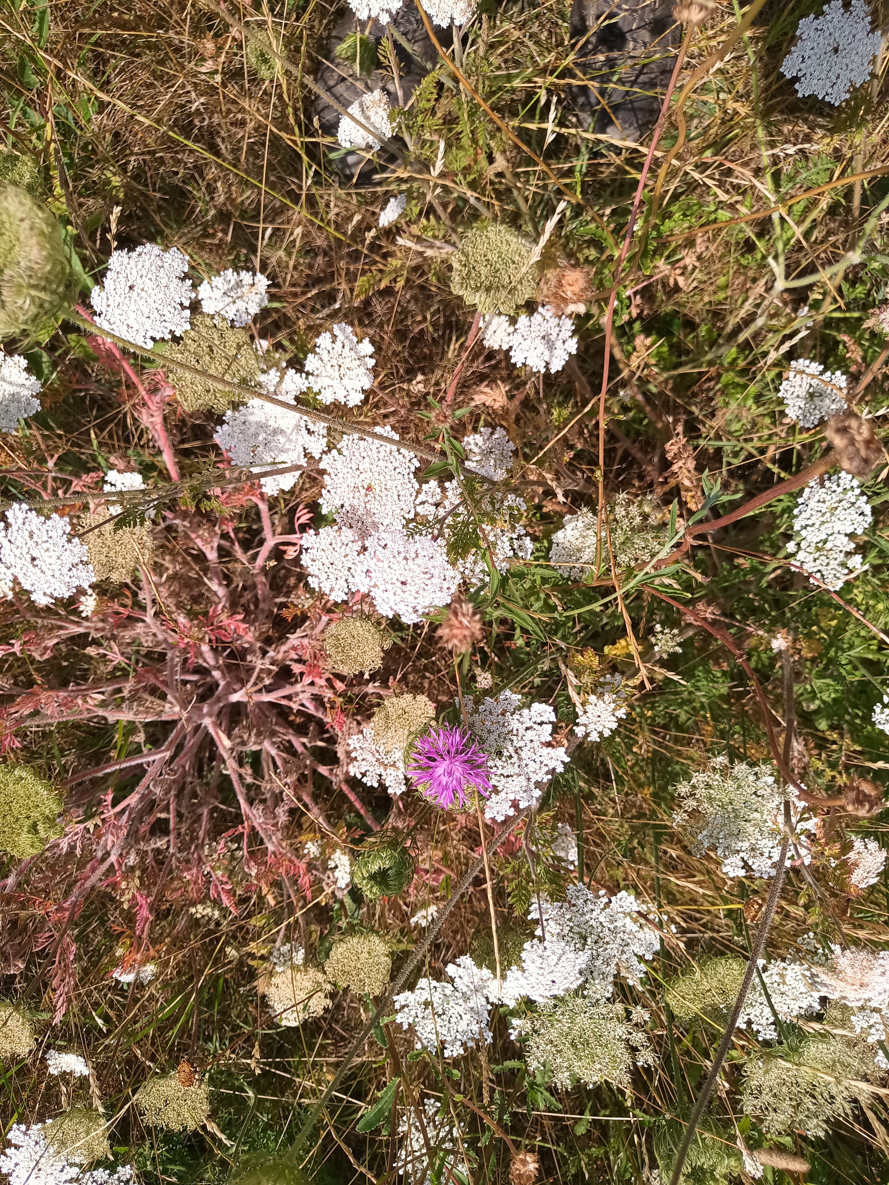 Queen Annes Lace has appeared in abundance and is a great plant for insects like bees as its tiny flowers are a rich source of nectar. Birds eat the seeds and mammals use the big umbrella like canopy to hide under. However, it is so abundant that if it is allowed to seed and is part of the hay cut, we could have even more next year and the year after. Our target is to create a species rich meadow and as you can see from the photo, there is one sole purple flower (common knapweed) amongst the backdrop of Queen Annes Lace.